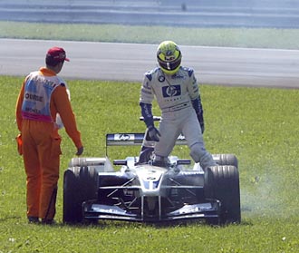 Ralf Schumacher of Germany and Williams breaks down at the first corner.