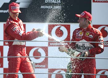 Rubens Barrichello led world champion Michael Schumacher to a runaway one-two win before a red sea of Ferrari fans in their team's home Grand Prix.