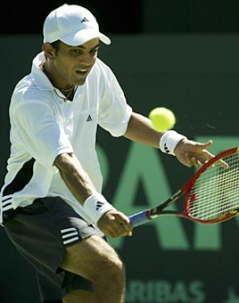 India's Harsh Mankad plays a backhand during his 1-6, 6-7, 1-6 loss to Australia's Lleyton Hewitt during the first day's play in the Davis Cup World Group Qualifying Tie at Memorial Drive, Adelaide, Australia.