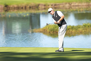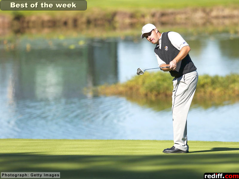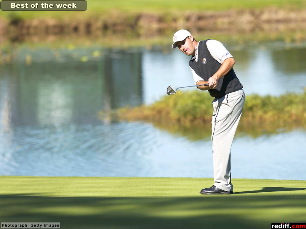 Europe's Padraig Harrington of Ireland on the 18th green during the third practice round for the 34th Ryder Cup at the De Vere Belfry in Sutton Coldfield, England.
