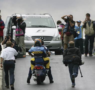 Alonso's car slewed and skidded into the tyre barriers with 18 laps to go while in the lead after a breathtaking charge from 15th place on the grid in wet conditions that caught out plenty of others.