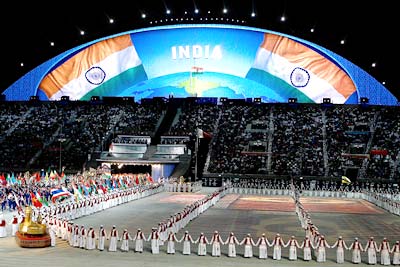 Indian athletes parade into the stadium during the opening ceremony of the 15th Asian Games Doha 2006 at the Khalifa