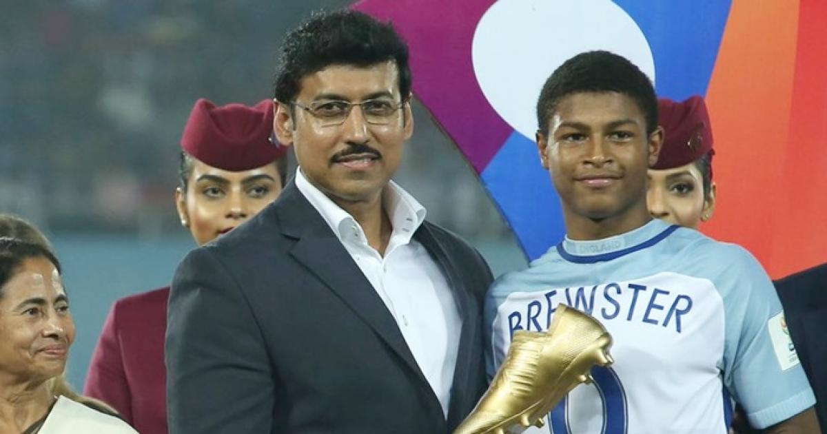 IMAGE: Rajyavardhan Singh Rathore presents the Golden Boot to England’s  Rhian Brewster. Photograph: Twitter.