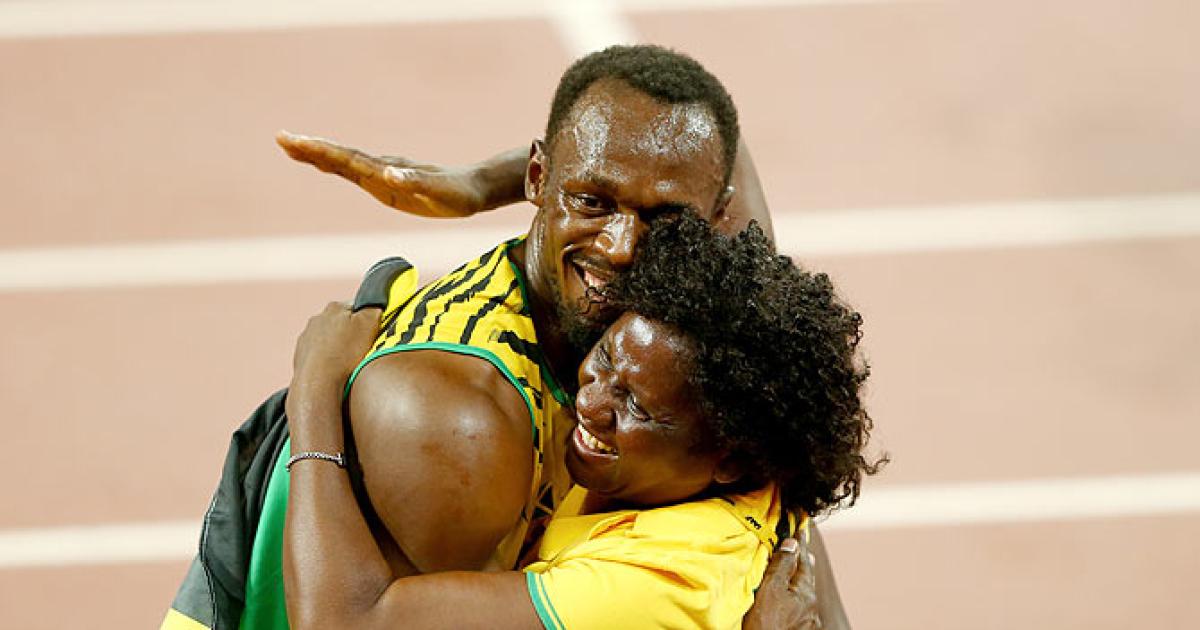 IMAGE: Jamaica's Usain Bolt celebrates with his mother Jennifer Bolt after winning gold in the men's 100 metres final on Day 2 of the 15th IAAF World Athletics Championships at the Beijing National Stadium, in China, on Sunday, August 23. Photograph: Michael Steele/Getty Images