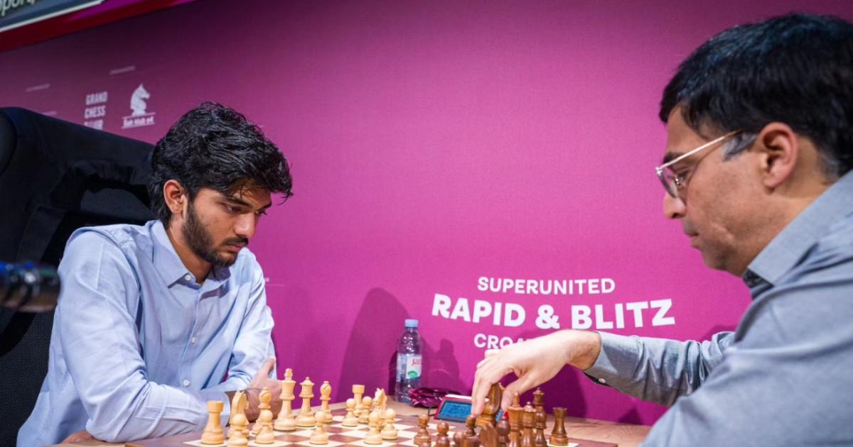 India's Viswanathan Anand and young GM D Gukesh slipped on the first day of the Blitz segment in the 2023 SuperUnited Rapid and Blitz tournament in Zagreb, part of the Grand Chess Tour.