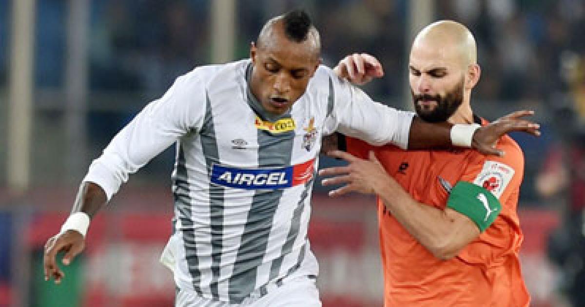 Image: Delhi Dynamos FC's captain Hans Mulder (orange) and Atletico De Kolkata's Fikru vie for the ball during the ISL 2014 match at Nehru Stadium in New Delhi
