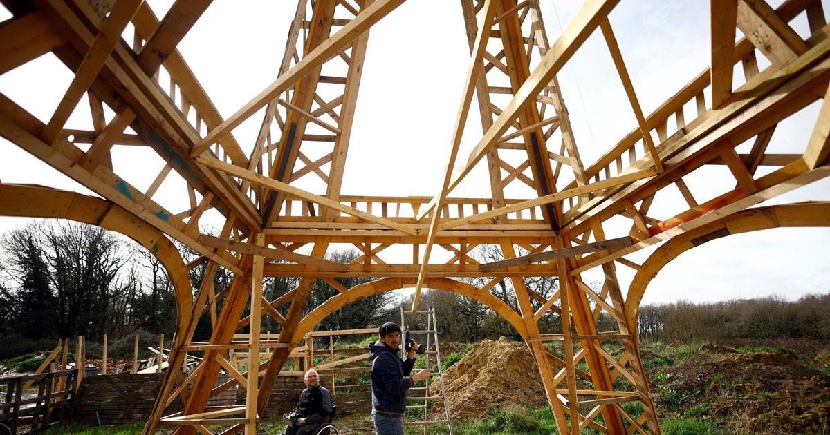 Two friends in western France have built a 16-metre (52 ft) high replica of the Eiffel Tower from recycled wood, which they hope to display along the path of the Summer 2024 Olympic torch relay and on Olympic sites.