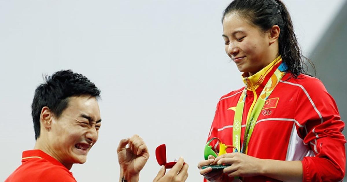China's He Zi received the shock of her life when team-mate and boyfriend Qin Kai rushed up with a diamond ring during the medal ceremony of the women's 3 metre springboard event, marking the second marriage proposal of the Olympics.