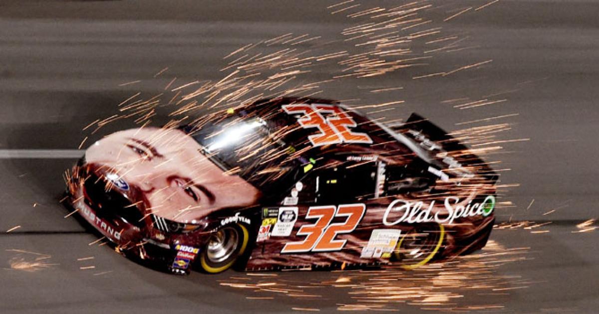 IMAGE: NASCAR Cup Series driver Corey LaJoie (32) gets a front end full of sparks from driver Casey Mears (not pictured) in turn four during the Gander RV Duel 2 at Daytona International Speedway at Daytona Beach, Florida, during the NASCAR Cup on Thursday, February 14. Photograph: John David Mercer-USA TODAY Sports