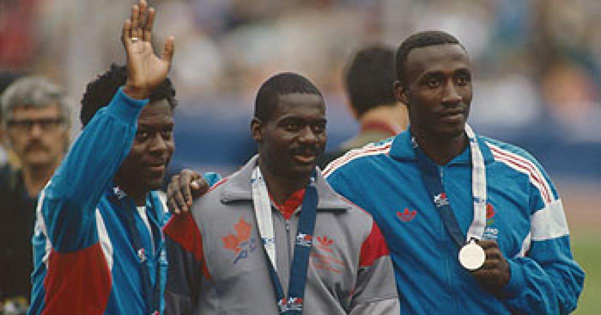 Image: Mike McFarlane (bronze medalist) of England, winner Ben Johnson of Canada (gold medalist) and Linford Christie (silver medalist) of England after the men's 100 metres during the 1986 Commonwealth Games in July 1986 in Edinburgh, Scotland