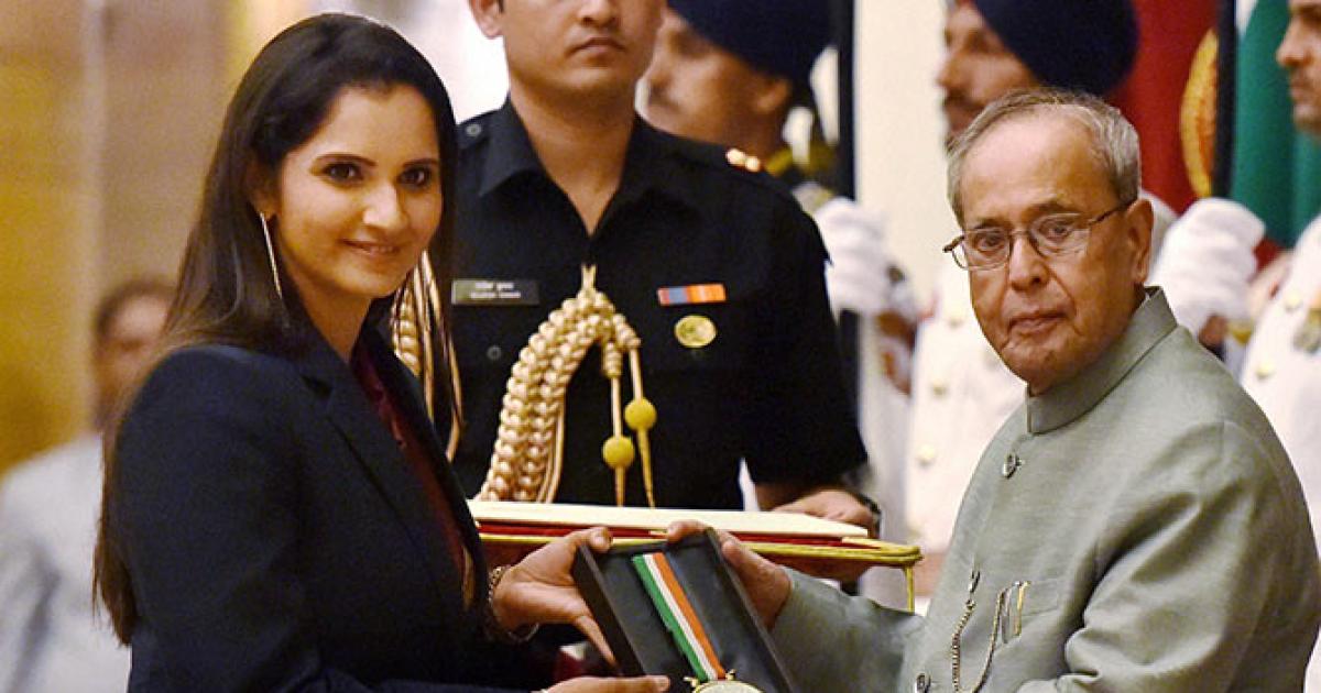 President Pranab Mukherjee presented the award to Sania, clad in a maroon saree and blue blazer, amid thunderous applause at the Darbar hall where Sports Minister Sarbananda Sonowal was among the attendees.