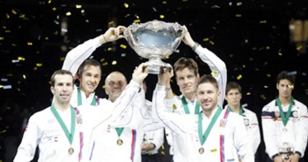 Image: (L-R) Radek Stepanek, Lukas Rosol (team captain), Vladimir Safarik, Tomas Berdych and Jan Hayek of Czech Republic hold the winners trophy aloft after a 3-2 victory against Serbia.