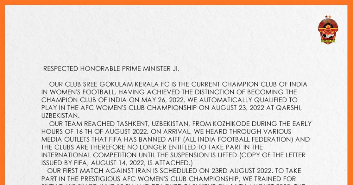Women’s I-League champions, Gokulam Kerala FC have written to Prime Minister Narendra Modi seeking his intervention.
