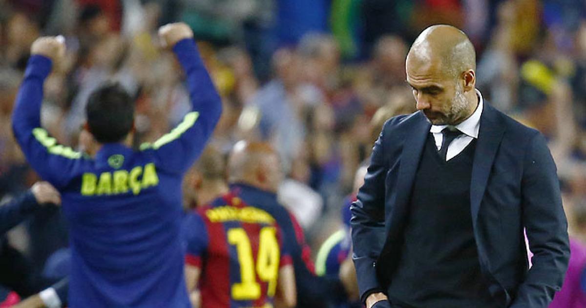 Bayern Munich coach Josep Guardiola looks dejected as Barcelona celebrate