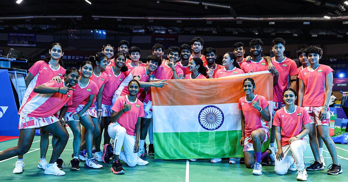 India stormed into the quarterfinals of the team event at the BWF World Junior Badminton Championships for the Suhandinata Cup with a clinical win over UAE, in Guwahati, on Wednesday.