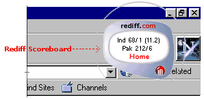 Step #1: Click on the above link, download scr.exe (91 Kb, download time <1 min at 28 kbps) and save it on your desktop. Step #2: Doubleclick on the above file for a one click installation. Step #3: Click on the wickets icon on your desktop or access it from the rediff.com folder in the Start menu. If you are behind a proxy server on a corporate network, Step #1: Right click anywhere on the scoreboard. Step #2: Choose options and enter your proxy settings. Remember, you can set the time lag for each score update by choosing options and keying the duration in minutes for each update. FEEDBACK |
