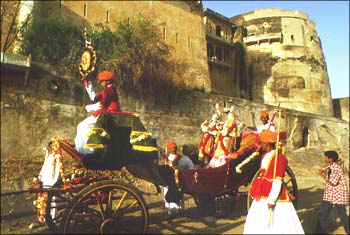 ![]() | After the Holi fire burns, the ashes and the mud are collected from the site. Clay idols, representing the gods, are molded and placed in temples. Each morning, women and young girls, grandly attired and carrying brass and earthen pots on their heads, filled with water and decked with flowers and leaves, singing Gangaur songs, can be seen in the streets on their way to the temple. For the next 18 days they worship these idols. BACK NEXT Sanjay Singh Badnor |