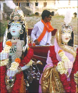 ![]() | The exquisitely painted and bejewelled Issarji and Gauri are in reality ancestral heirlooms. There is a history behind these idols. This Issarji was captured from the Jaipur royal family and brought to Kishangarh about 1750 during the reign of Maharaja Bahadur Singh of Kishangarh. This was considered a Rajput act of bravado. BACK NEXT Sanjay Singh Badnor |
