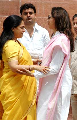 Image: Samajwadi Party MP Jaya Bachchan and BJP MP Hema Malini outside Parliament.